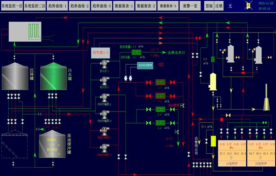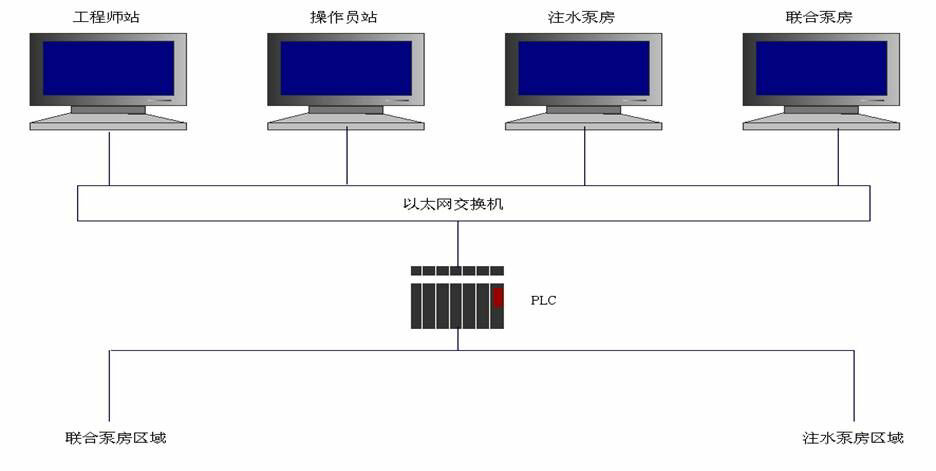 本系統(tǒng)采用工業(yè)以太網(wǎng)通訊方式,共設(shè)置4套監(jiān)控系統(tǒng),分別為:工程師站,操作員站,注水泵房站及聯(lián)合泵房站。