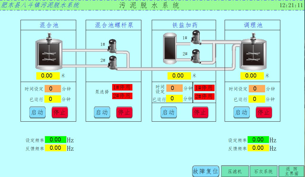 本項(xiàng)目為八斗鎮(zhèn)生活污水處理廠污泥脫水系統(tǒng)。本項(xiàng)目采用施耐德TM221PLC與威綸通10寸觸摸屏以太網(wǎng)通訊連接并進(jìn)行控制。同時(shí)與項(xiàng)目上施耐德PLC通過(guò)Modbus-TCP通訊采集信號(hào)、西門(mén)子200smartPLC通過(guò)Modbus-RTU通訊采集信號(hào)控制整個(gè)污水處理廠的污泥脫水系統(tǒng)自動(dòng)控制。各設(shè)備通過(guò)采集設(shè)備信號(hào)做出運(yùn)行與保護(hù)判斷,同時(shí)具有就地控制與遠(yuǎn)程控制。每臺(tái)設(shè)備的供電系統(tǒng)出現(xiàn)故障都會(huì)報(bào)出相應(yīng)故障,系統(tǒng)同時(shí)配備了運(yùn)行模式與調(diào)試/維修模式,更方便與前期調(diào)試與后期維護(hù)。